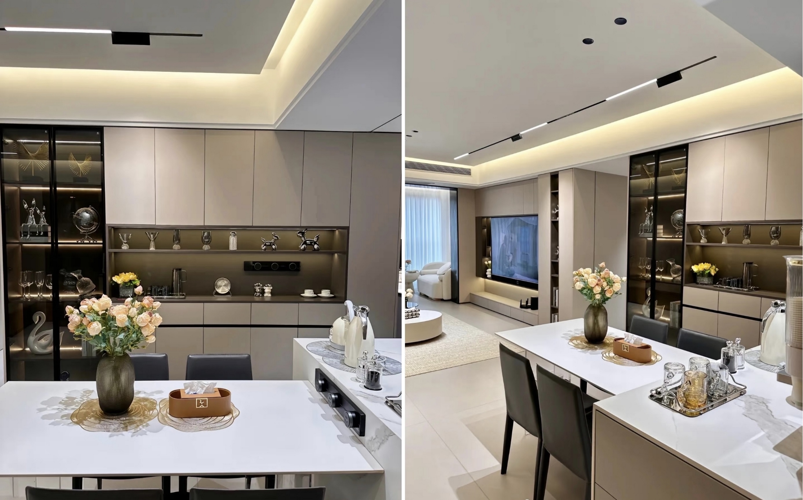 1. Весь будинок прокладений 1500*750 тепла сіра матова плитка, використовуючи той самий колір піску епоксидного кольору, без будь -яких порогових каменів, що робить простір більш прозорим.